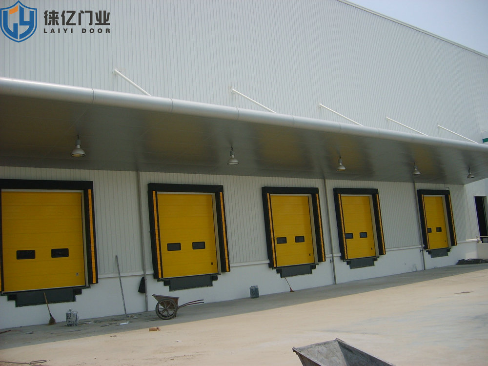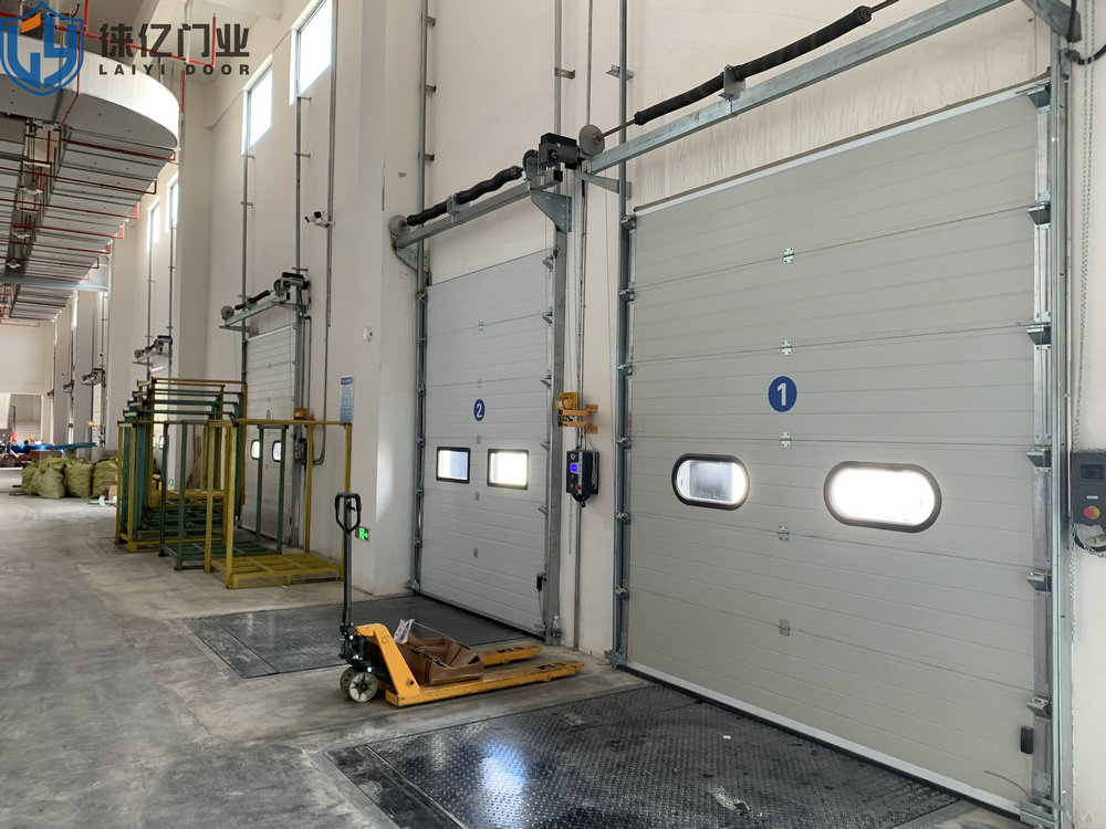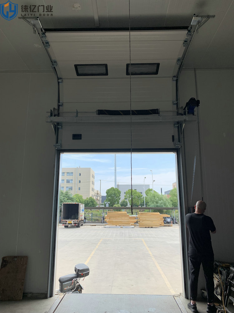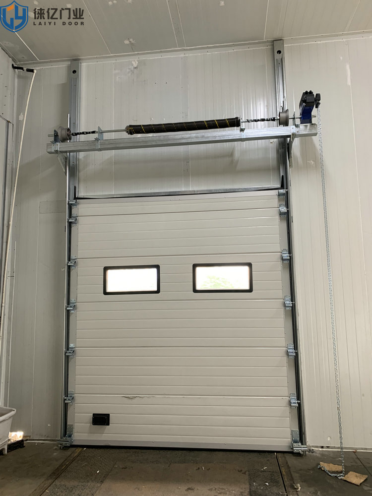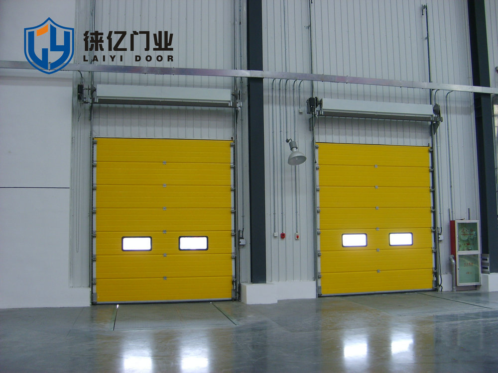 工业滑升门,门板采用表面聚脂工艺处理的双层夹心热浸镀锌钢板,芯部材料为聚氨脂绝缘保温层,厚为42mm。门体端面配置有箱形封边,联接铰链装在封边上,使门体嵌入轨道。底部和顶部固定有沿门宽度和高度方向的球状乙烯树脂制成的顶部、底部密封条和侧向密封条,防风、防雨、防渗入。门体平衡系统由扭簧、绕线轮及钢轴和锁紧、固定法兰等组成,轮上绕有钢索,钢索与门体底部防钢索断裂装置相连。因此,在平衡状态下,不用电机提升门体也很方便。特点:手动、电动功能(30秒内全部开启)防风、防雨、防渗漏密封性好;
